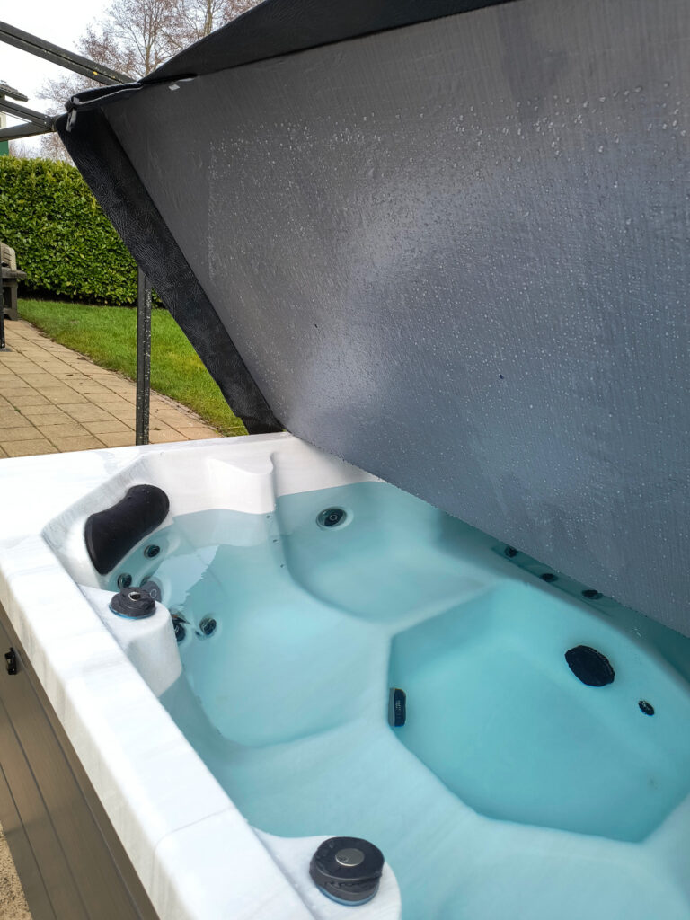 Die isolierende Abdeckung können Sie einfach aufklappen und bei Seite legen. Nach der Nutzung bitten wir Sie, die Abdeckung unmittelbar wieder auf den Pool zu legen. Dies spart Energie und schützt den Whirlpool vor Verunreinigung.Bitte klippsen Sie die Halterung der Abdeckung ein, damit diese bei Wind nicht abfliegen kann.